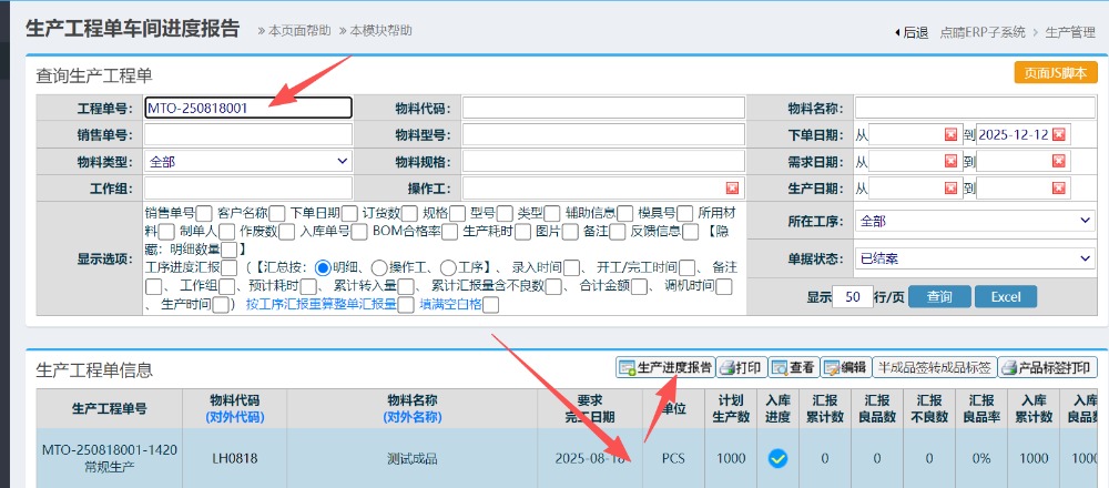 操作步骤:生产管理-生产进度及汇报-生产进度汇报