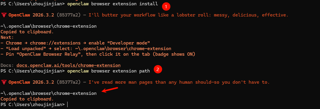整个操作过程还是非常简单的,总共分两步,第一步安装OpenClaw的插件,第二步安装谷歌浏览器的拓展程序。