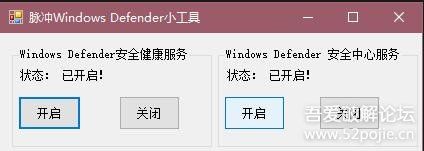 using System;using System.Collections.Generic;using System.ComponentModel;using System.Data;using System.Drawing;using System.Linq;using System.Text;using System.Threading.Tasks;using System.Windows.Forms;using Microsoft.Win32;//BY-MCtechnamespace 关闭Windows_defender{ public partial class Form1 : Form { public Form1() { InitializeComponent(); RegistryKey key1 = Registry.LocalMachine; RegistryKey software1 = key1.OpenSubKey(@"SYSTEM\CurrentControlSet\Services\SecurityHealthService"); string GetValue1 = software1.GetValue("Start").ToString(); if(GetValue1 == "2") { label1.Text = "状态: 已开启!"; } else if (GetValue1 == "3") { label1.Text = "状态: 已被第三方软件接管!"; } else if (GetValue1 == "4") { label1.Text = "状态: 已关闭!"; } RegistryKey key2 = Registry.LocalMachine; RegistryKey software2 = key2.OpenSubKey(@"SYSTEM\CurrentControlSet\Services\wscsvc"); string GetValue2 = software2.GetValue("Start").ToString(); if (GetValue2 == "2") { label2.Text = "状态: 已开启!"; } else if (GetValue2 == "4") { label2.Text = "状态: 已关闭!"; } } private void Button1_Click(object sender, EventArgs e) { //开启安全健康服务 RegistryKey key1 = Registry.LocalMachine; RegistryKey software1 = key1.OpenSubKey(@"SYSTEM\CurrentControlSet\Services\SecurityHealthService", true); software1.SetValue("Start",2); string GetValue1 = software1.GetValue("Start").ToString(); if (GetValue1 == "2") { MessageBox.Show("开启成功!重启生效"); label1.Text = "状态: 已开启!"; } else { MessageBox.Show("错误!请以管理员权限运行若仍未解决我也没办法!"); } } private void Button2_Click(object sender, EventArgs e) { //关闭安全健康服务 RegistryKey key1 = Registry.LocalMachine; RegistryKey software1 = key1.OpenSubKey(@"SYSTEM\CurrentControlSet\Services\SecurityHealthService", true); software1.SetValue("Start", 4); string GetValue1 = software1.GetValue("Start").ToString(); if (GetValue1 == "4") { MessageBox.Show("关闭成功!重启生效"); label1.Text = "状态: 已关闭!"; } else { MessageBox.Show("错误!请以管理员权限运行若仍未解决我也没办法!"); } } private void Label1_Click(object sender, EventArgs e) { //安全健康服务状态 } private void Label2_Click(object sender, EventArgs e) { //安全中心服务状态 } private void Button4_Click(object sender, EventArgs e) { //关闭window Defender安全中心服务 RegistryKey key2 = Registry.LocalMachine; RegistryKey software2 = key2.OpenSubKey(@"SYSTEM\CurrentControlSet\Services\wscsvc", true); software2.SetValue("Start", 4); string GetValue2 = software2.GetValue("Start").ToString(); if (GetValue2 == "4") { MessageBox.Show("关闭成功!重启生效"); label2.Text = "状态: 已关闭!"; } else { MessageBox.Show("错误!请以管理员权限运行若仍未解决我也没办法!"); } } private void Button3_Click(object sender, EventArgs e) { //开启window Defender安全中心服务 RegistryKey key2 = Registry.LocalMachine; RegistryKey software2 = key2.OpenSubKey(@"SYSTEM\CurrentControlSet\Services\wscsvc", true); software2.SetValue("Start", 2); string GetValue2 = software2.GetValue("Start").ToString(); if (GetValue2 == "2") { MessageBox.Show("开启成功!重启生效"); label2.Text = "状态: 已开启!"; } else { MessageBox.Show("错误!请以管理员权限运行若仍未解决我也没办法!"); } } private void GroupBox1_Enter(object sender, EventArgs e) { } private void Form1_Load(object sender, EventArgs e) { } }}请以管理员权限运行!请以管理员权限运行!请以管理员权限运行!重启生效,