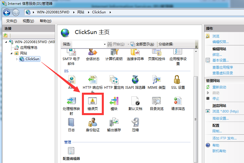 打开IIS管理器,找到网站ClickSun-》错误页,双击“错误页”: