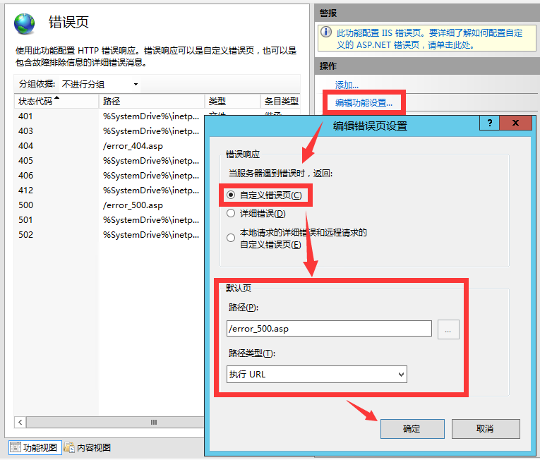 双击“错误页”,然后点击右边的“编辑功能设置”: