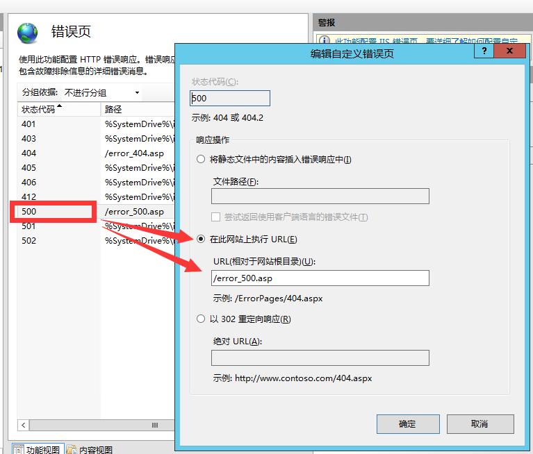 响应操作改为:在此网站上执行URL,URL地址还是上面自己开发的自定义错误拦截页面(页面核心代码见上面):/error_500.asp,然后确定保存即可生效。