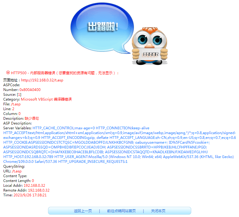 当然,设计这个HTTP500错误页面拦截的根本目的就是不想用户或黑客攻击者看到真实的错误代码,但又需要将这些错误信息发送给开发者或网管,所以需要在自定义的错误拦截页面error_500.asp中,将上面的真实错误信息保存到数据库或文本文件中,方便开发人员或网管予以分析解决,给用户或黑客攻击者看到的只需要是一个简单的错误提醒图片即可。