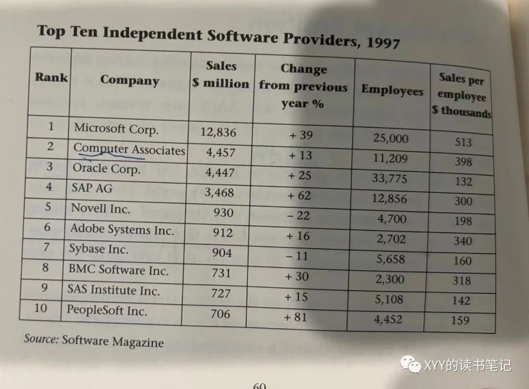 Vobis——R/3应用案例。R/3的软件主要分为会计(FI)、控制(CO)和人力资源(HR)三大模块,客户采购软件也是以模块来定价的,到1996年每一个终端的授权费用约为2700到4000美元。Vobis是德国大型电子零售连锁,其销售产品以计算机为主,传统模式下用户体验较差——店员顾不及服务客户,顾客经常拿到的不是自己订购型号,回家拆开包装后才发现。然而,Vobis花费1400万美元(R/3采购门槛最低是400万美元)部署R/3后迎来了巨大变化,其极大提升库存管理效率(降低了20%库存),当系统识别到特定产品的库存低于设定值时,其就会自动下单补货,同时极大缩小用户订购需要等待的时间。从R/3部署来看,其主要分为三个层次,首先是数据服务器底层,其数据库可以基于Oracle,也可以基于微软数据库等,服务器则可以采用惠普服务器;第二层是R/3的应用服务器,基于联网服务器工作站,运行核心R/3软件部分,基于采购不同模块进行部署。第三层是使用终端,一般基于PC和Windows操作系统,基于用户分析需求,基于GUI展示想要的数据处理和分析结果。 采用和外部咨询公司合作开拓市场 采用外包咨询模式。当一家公司要部署R/3产品时,由于产品复杂性,其一般需要依赖外部IT专家来帮助公司进行部署,但由于当时R/3产品先进性这种专家资源非常稀缺,导致部署人力成本很高。对于R/3来说,其产品采购成本VS产品部署成本比例可以达到惊人的1:5甚至1:10,以至于竞争对手比如Oracle,Baan等将部署成本更低作为卖点,他们宣传采购和部署比例是1:2,1995年Hopp自己也承认R/3的部署效率需要提升。整体来看R/3的服务部分主要分成三大部分——技术支持、教育培训、实时咨询,截至1997年,SAP有2400名技术支持相关员工,占比18%;有六个教育培训中心;有4200名咨询专家(占比员工33%),但是这些还远远不够,其主要采用的是外包合作——和软件公司、咨询公司合作(System integrators),其外包合作有超过3万名咨询专家。实际上,SAP是当时主流企业软件公司中,首先采用如此大规模和外部咨询公司合作模式开创者,其产品经理Alexander说:“我们不认为SAP是大型项目管理专家,但我们对产品却是最专业的。”为了进一步统一咨询专家的技能水平,SAP还推出专业技能认证考试,专家也需要持证上岗。 咨询公司也兼任销售,帮助公司触达客户高层。Plattner是SAP外包咨询公司模式主导者,他认为SAP当然可以自己做这部分,但这肯定会使得公司分心。但实际上,这个模式也成就了SAP在R/3上的销售奇迹——虽然IT咨询公司名义上是站在企业客户的视角,为他们提供IT部署的专业建议,但实际上,其站在咨询和销售的灰色位置上,实际上,他们承担了SAP产品的销售渠道职能——尤其是,他们能够帮助SAP直接触达企业客户的CEO等高层级别高管,这样高效进行采购决策(和Oracle一样,SAP不会理IT负责人,直接走上层路线)。和咨询公司合作同样会反哺SAP自己的产品,比如Hans Georg其公司开发一款管理软件,就被SAP采纳融入了R/2和R/3产品。R/3创造巨大经济价值,以及这种外包模式创造巨大生态,着实具有开创性,下图是目前全球IT软件咨询行业规模,以及排名前列的咨询公司。 SAP攻克美国市场。1989年和1990年,SAP在美国营收是700万美元和1600万美元,R/2产品在美国市场不大,且竞争激烈(IBM主机淘汰更早),到1993年,SAP1800名客户中,只有70名在美国,SAP品牌在美国也没有什么知名度,甚至被读为sap,后来公司纠正是三个字母S.A.P。一切的变化就是R/3,这个划时代产品推出后,SAP选择和美国六大咨询公司全面合作进行产品推广,其从石油化工、医药等特定行业先行切入,对销售提成激励取消上限(增加积极性),很快收获了Chevron的大单——R/3和服务器工作站的搭配最开始目的是服务中型企业,结果发现对大企业也很合适,而SAP是唯一提供这个选项的厂商,因此R/3开始大受欢迎。AutoDesk也很快成为SAP的客户,其公司40款产品内部有2万个代码,但是R/3部署后,下降为1600个。客户下单后交付时间最开始是2周,部署R/3后下降到24小时。1994年,IBM成为SAP的大客户,其准备使用R/3来管理采购和订单等。1995年微软也成为SAP大客户(实际上微软早期和SAP一直是合作伙伴,后来才变成了其主要竞争对手)。不过,也有失手时候,比如波音就被竞争对手Baan抢走了。SAP在美国持续开拓办公室,并且在硅谷开设开发中心,Plattner会花三分之一的时间在美国。SAP在美国营收从1992年6000万美元提升到1997年12亿美元,占比公司营收35%。 SAP公司扁平公司文化 SAP公司文化类似惠普。【读书】惠普之道:引领硅谷创业的鼻祖里面我们曾经谈到过惠普和员工契约精神的文化,就是我给你自由,你给我创意;我给你稳定(不裁员),你给我回报,实际上是员工和公司之间一种契约精神。Hopp也曾经公开场合说过SAP的开放公司文化类似惠普,总结下来主要有四点:1.赋能而不是控制(context not control);2.相信员工,而不是机械官僚化的说教;3.扁平的公司文化;4.质量控制无处不在。实际上,SAP公司大层级主要就是董事会,部门高管和员工三层,1989年一篇媒体报道说SAP没有工作介绍、没有员工title,没有着装准则(对比IBM blue suite),没有deadline(幸福)。公司鼓励员工沟通,鼓励各种社交活动增进互相了解。SAP拥有自由的工作时间,如果员工想回家随时。公司给员工提供终身学习的机会(SAP公司氛围也有点像大学),员工也拥有自愿决定是否内部轮岗的权利。员工待遇方面,1990年代