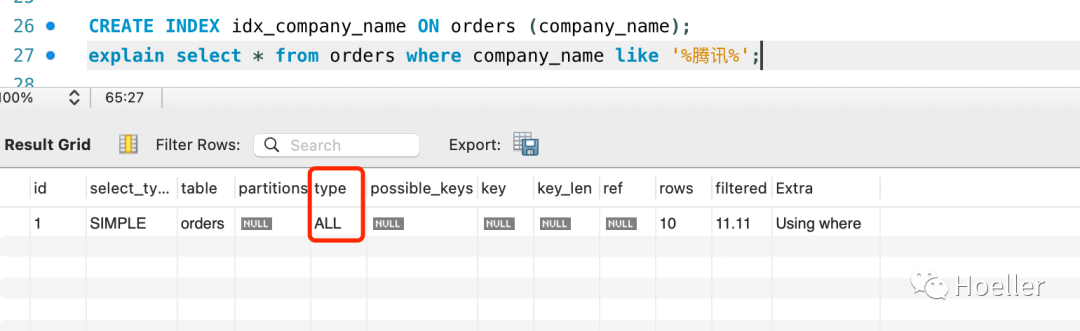 就算给company_name创建一个索引,执行where company_name like '%腾讯%'也不会走索引。