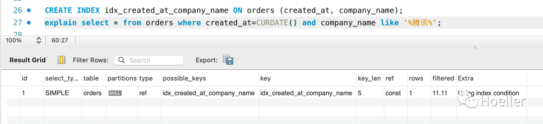 但是如果给created_at, company_name创建一个联合索引,那么执行where created_at=CURDATE() and company_name like '%腾讯%'就会走联合索引,并且company_name like '%腾讯%'就会利用到索引条件下推机制,比如下图中Extra里的Using index condition就表示利用了索引条件下推。
