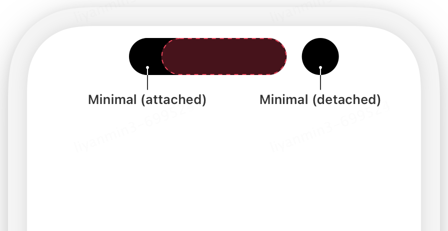 当系统有多个实时活动的内容时,灵动岛自动切换使用最小化模式。最小化模式下由附着的头部(Leading(attached))和分割开的尾部(Trailing(detached))组成,如图所示。和紧凑模式一样,最小化模式也支持用户点击打开 App。