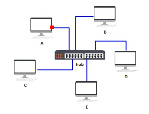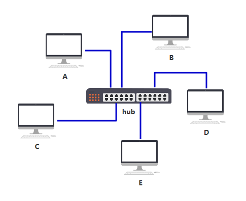 于是你们发明了一个中间设备,你们将网线都插到这个设备上,由这个设备做转发,就可以彼此之间通信了,本质上和原来一样,只不过网口的数量和网线的数量减少了,不再那么混乱。