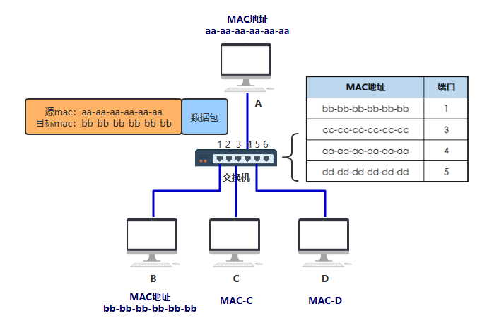 由于这个包从端口 4 进入的交换机,所以此时交换机就可以在 MAC地址表记录第一条数据: MAC:aa-aa-aa-aa-aa-aa-aa 交换机看目标 MAC 地址(bb-bb-bb-bb-bb-bb)在地址表中并没有映射关系,于是将此包发给了所有端口,也即发给了所有机器。 之后,只有机器 B 收到了确实是发给自己的包,于是做出了响应,响应数据从端口 1 进入交换机,于是交换机此时在地址表中更新了第二条数据: MAC:bb-bb-bb-bb-bb-bb 过程如下