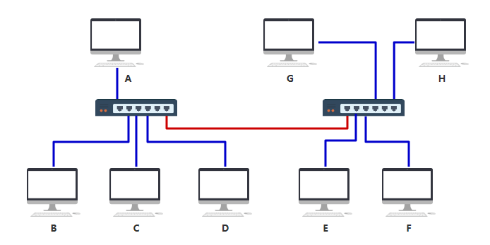 你完全不需要设计额外的东西,只需要按照之前的设计和规矩来,按照上述的接线方式即可完成所有电脑的互联,所以交换机设计的这种规则,真的很巧妙。你想想看为什么(比如 A 要发数据给 F)。 但是你要注意,上面那根红色的线,最终在 MAC 地址表中可不是一条记录呀,而是要把 EFGH 这四台机器与该端口(端口6)的映射全部记录在表中。 最终,两个交换机将分别记录 A ~ H 所有机器的映射记录。 左边的交换机