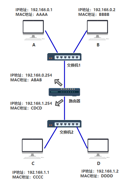 如上图所示,假如我想要发送数据包给 ABCD 其中一台设备,不论哪一台,我都可以这样描述,"将 IP 地址为 192.168.0 开头的全部发送给到路由器,之后再怎么转发,交给它!",巧妙吧。 那交给路由器之后,路由器又是怎么把数据包准确转发给指定设备的呢? 别急我们慢慢来。 我们先给上面的组网方式中的每一台设备,加上自己的 IP 地址