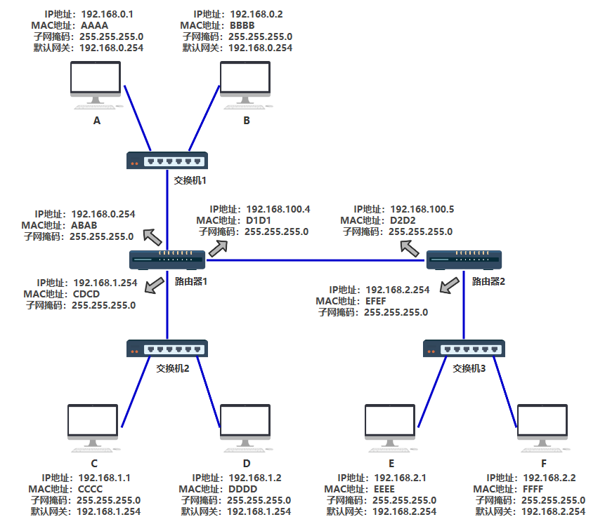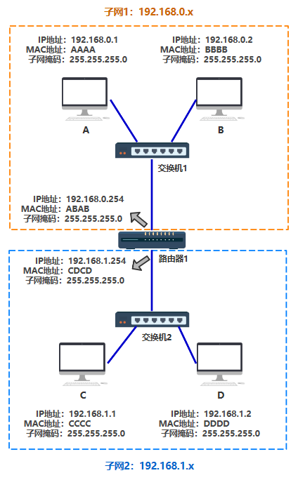 注意,路由器的每一个端口,都有独立的 MAC 地址 好了,现在交换机的 MAC 地址表中,只需要多出一条 MAC 地址 ABAB 与其端口的映射关系,就可以成功把数据包转交给路由器了,这条搞定。 那如何做到,把发送给 C 和 D,甚至是把发送给 DEFGH.... 的数据包,统统先发送给路由器呢? 不难想到这样一个点子,假如电脑 C 和 D 的 MAC 地址拥有共同的前缀,比如分别是 那我们就可以说,将目标 MAC 地址为 FFFF-FFFF-?开头的,统统先发送给路由器。 这样是否可行呢?答案是否定的。 我们先从现实中 MAC 地址的结构入手,MAC地址也叫物理地址、硬件地址,长度为 48 位,一般这样来表示 00-16-EA-AE-3C-40 它是由网络设备制造商生产时烧录在网卡的EPROM(一种闪存芯片,通常可以通过程序擦写)。其中前 24 位(00-16-EA)代表网络硬件制造商的编号,后 24 位(AE-3C-40)是该厂家自己分配的,一般表示系列号。只要不更改自己的 MAC 地址,MAC 地址在世界是唯一的。形象地说,MAC地址就如同身份证上的身份证号码,具有唯一性。 那如果你希望向上面那样表示将目标 MAC 地址为 FFFF-FFFF-?开头的,统一从路由器出去发给某一群设备(后面会提到这其实是子网的概念),那你就需要要求某一子网下统统买一个厂商制造的设备,要么你就需要要求厂商在生产网络设备烧录 MAC 地址时,提前按照你规划好的子网结构来定 MAC 地址,并且日后这个网络的结构都不能轻易改变。 这显然是不现实的。 于是你发明了一个新的地址,给每一台机器一个 32 位的编号,如: 11000000101010000000000000000001 你觉得有些不清晰,于是把它分成四个部分,中间用点相连。 11000000.10101000.00000000.00000001 你还觉得不清晰,于是把它转换成 10 进制。 192.168.0.1 最后你给了这个地址一个响亮的名字,IP 地址。现在每一台电脑,同时有自己的 MAC 地址,又有自己的 IP 地址,只不过 IP 地址是软件层面上的,可以随时修改,MAC 地址一般是无法修改的。 这样一个可以随时修改的 IP 地址,就可以根据你规划的网络拓扑结构,来调整了。