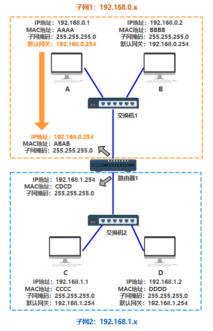 所以如果 A 给 C 发消息,A 和 C 的 IP 地址分别 & A 机器配置的子网掩码,发现不相等,则 A 认为 C 和自己不在同一个子网,于是把包发给路由器,就不管了,之后怎么转发,A 不关心。 A 如何知道,哪个设备是路由器? 答案:在 A 上要设置默认网关 上一步 A 通过是否与 C 在同一个子网内,判断出自己应该把包发给路由器,那路由器的 IP 是多少呢? 其实说发给路由器不准确,应该说 A 会把包发给默认网关。 对 A 来说,A 只能直接把包发给同处于一个子网下的某个 IP 上,所以发给路由器还是发给某个电脑,对 A 来说也不关心,只要这个设备有个 IP 地址就行。 所以默认网关,就是 A 在自己电脑里配置的一个 IP 地址,以便在发给不同子网的机器时,发给这个 IP 地址。