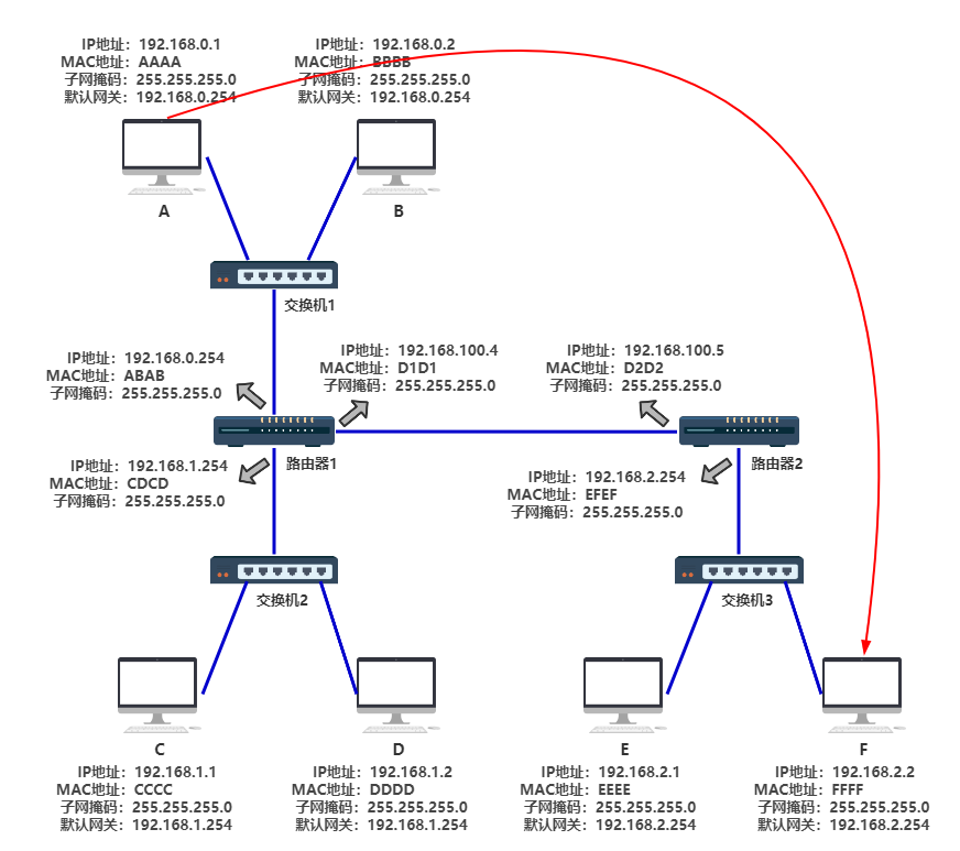 这时如果 A 给 F 发送一个数据包,能不能通呢?如果通的话整个过程是怎样的呢?