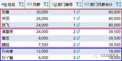 前 3 行数据的部门编号都为 1,因此该部门的月薪合计为 30000 + 26000 + 24000 = 80000;其他部门的数据也采用同样的方式进行计算。
