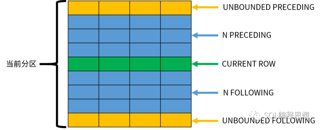 CURRENT ROW表示当前正在处理的行;其他的行可以使用相对当前行的位置表示。需要注意,窗口的大小不会超出当前分区的范围。