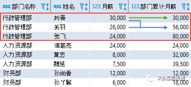 对于“行政管理部”,第一个员工的月薪为 30000,累计也是 30000;第二个员工的月薪为 26000,累计为 30000 + 26000 = 56000;依此类推,直到统计完该部门的所有员工;然后开始统计下一个部门的数据。