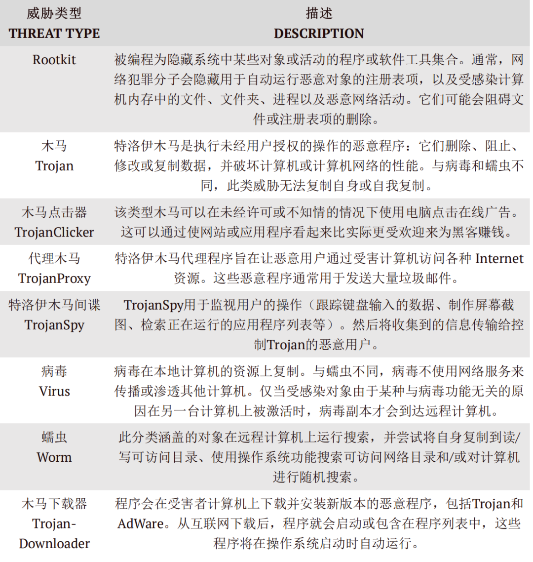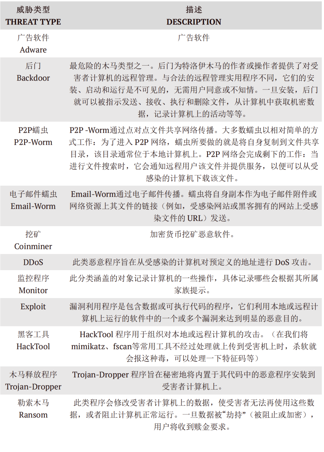 好久没有发文章了,最近搞免杀的时候看群里有的师傅在问杀软报毒是哪种类型,简单搜了一下,国内好像没有这种文章,也可能我信息收集的能力太差,没有直接搜到,于是突发奇想写一篇,就当作科普文吧,讲一讲杀软的报毒命名规则和一些常见的恶意软件类型。有错误或者遗漏的地方还请师傅们多多指教。 杀毒软件的报毒基本遵循一套原则,就是“CARO”原则,由反病毒专家联盟 CARO提出,遵循以下格式: <威胁类型>.<平台>.<恶意软件系列>.<变体>.<其他信息*> 卡巴斯基在此基础上添加了前缀: [前缀:]<威胁类型/行为>.<平台>.<恶意软件家族><.变体><其他信息> 前 缀 该前缀标识检测到该对象的子系统。 前缀“HEUR:”用于表示启发式分析器检测到的对象; 前缀“PDM:”用于表示主动防御模块检测到的对象。 前缀不是全名的必需部分,并且可能不存在。 前缀这一部分,是卡巴斯基实验室反病毒数据库早期提出,该司在2007年推出的一个启发式模块,当该模块检测到对象时,对象的名称以“HEUR:”前缀开头。 主动防御模块是监视系统中应用程序执行的操作顺序的模块,如果检测到可疑活动,则阻止该应用程序进行进一步的活动。如果 是PDM 检测到某个威胁程序,则该威胁程序的名称以“PDM:”前缀开头。 这两个模块都分析对象的活动(或活动序列)。如果该活动是典型的恶意程序,则启发式分析器或 PDM 将检测到该对象。 行 为 威胁类型/行为代表主要威胁类别,描述威胁的主要行为是什么。 对于恶意软件:Trojan(木马)、Worm(蠕虫)、Virus(病毒)、Ransomware(勒索软件)、Coinminer(挖矿) 和Backdoor(后门)是我们最常见的威胁类型。 对于灰色软件:Adware广告软件、Spyware间谍软件和 PUA 是最常见的威胁类型。 在这里讲一下常见的威胁类型和他们的一些对应操作,以后大家碰到报毒也可以对着看看究竟是哪部分出了问题:   平 台 平台是指恶意软件开发时,设定的能够执行的环境,涵盖软件和硬件。这包括操作系统:Windows(Win32、Win64)、Mac OS、Linux 和 Android,以及编程语言和文件格式(Microsoft Word/Excel/PowerPoint)。 对于可以在多个平台上运行的检测到的对象,该项被命名为为“Multi(多)”。Virus.Multi.Etapux 是多平台恶意程序的示例之一。该程序会感染 Windows 和 Linux 操作系统的可执行文件。 家 族 用于表示一组具有相同来源(作者、源代码)、操作原理或有效负载的检测到的对象。每个家族都是根据其表现的行为来命名的。常见的就是:Generic、Infector、AntiAV、KillFiles等。 变 体 为了识别一个家族中不同恶意软件的变体,字母按顺序使用并称为变体,从“.a”开始:“.a”-“.z”、“.aa”-“.zz”等。 变体不是全名的强制部分,并且可能不存在。 被认为有助于进一步了解某些复杂威胁的信息可以利用命名方案的这个可选部分。例如,dldr 表示下载器。因此,检测名称 Ransom.Win32.Locky.A.dldr 提供的信息表明该威胁程序是 Locky Ransomware 的下载程序。 样例 举一些恶意软件的分类和他们的作用: HEUR:Worm.[Platform].Generic 此分类涵盖的对象在远程计算机上运行搜索,并尝试将自身复制到读/写可访问目录、使用操作系统功能搜索可访问网络目录和/或对计算机进行随机搜索。 [Platform] 字段可以是“Script”或“Win32”。 HEUR:Virus.[Platform].Generic 此分类涵盖的对象会在受害计算机的本地资源上创建自身的副本。 [Platform] 字段可以是“Script”或“Win32”。 HEUR:Email-Worm.[Platform].Generic 此分类涵盖的对象尝试以电子邮件附件的形式发送自身的副本,或者作为位于网络资源上的自身文件的链接。 [Platform] 字段可以是“Script”或“Win32”。 HEUR:Virus.[Platform].Infector 此分类涵盖的对象在计算机中搜索文件并将一系列信息写入这些文件。例如,这样的对象可以将其主体写入可执行文件或写入包含指向具有 .html、.php、.asp 和其他扩展名的文件的链接的 HTML 代码。 [Platform] 字段可以是“Script”或“Win32”。 PDM:Worm.Win32.Generic 此分类涵盖的对象搜索远程计算机网络并尝试将自身复制到读/写可访问目录、使用操作系统功能搜索可访问网络目录和/或对计算机进行随机搜索。 PDM:P2P-Worm.Win32.Generic 此分类涵盖的对象将自身复制到通常与 P2P 客户端关联的文件夹、修改与 P2P 客户端关联的注册表项等。 HEUR:Trojan.[Platform].Generic 此分类涵盖的对象会删除、阻止、修改或复制信息,并破坏计算机或计算机网络的性能。[Platform] 字段可以是“Script”或“Win32”。 HEUR:Trojan.Win32.Invader 此分类涵盖的对象将其代码注入其他进程的地址空间。 病毒编写者经常使用这种策略来执行各种操作,就好像这些操作是由受信任的应用程序执行的一样。 HEUR:Trojan.[Platform].AntiAV 此分类涵盖的对象会阻止防病毒程序和防火墙工作。 [Platform] 字段可以是“Script”或“Win32”。 HEUR:Trojan.[Platform].KillFiles 此分类涵盖的对象删除用户文件和/或操作系统文件。 [Platform] 字段可以是“Script”或“Win32”。 HEUR:Trojan.[Platform].StartPage 此分类涵盖的对象会修改 StartPage、SearchPage 和其他 Internet 浏览器设置。 [Platform] 字段可以是“Script”或“Win32”。 HEUR:Trojan.Script.Iframer 此分类涵盖的对象通过使用隐藏标签在用户不知情的情况下访问互联网资源。 HEUR:Trojan.[Platform].Cryptic 此分类涵盖的对象是高度加密或混淆的。 [Platform] 字段可以是“Script”或“Win32”。 HEUR:Backdoor.[Platform].Generic 此分