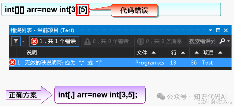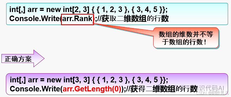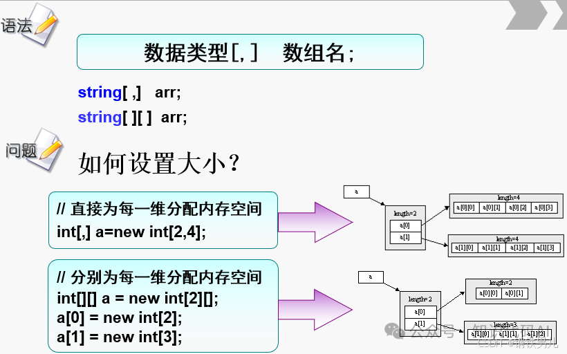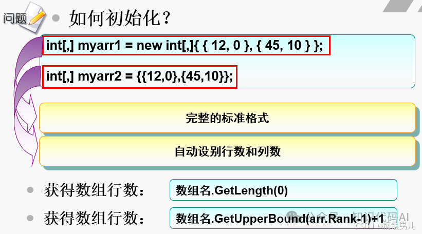 int[,] arr = new int[2, 3] { { 1, 2, 3 }, { 3, 4, 5 }};//定义二维数组