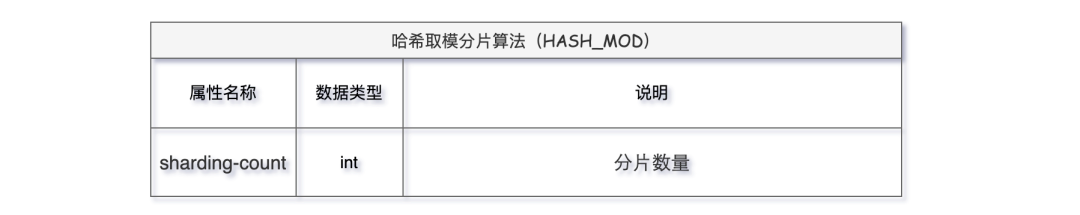 哈希取模分片算法是内置取模分片算法的一个升级版本,定义算法时类型HASH_MOD,也只有一个props属性sharding-count代表分片的数量。表达式hash(分片健/数据库实例) % sharding-count
