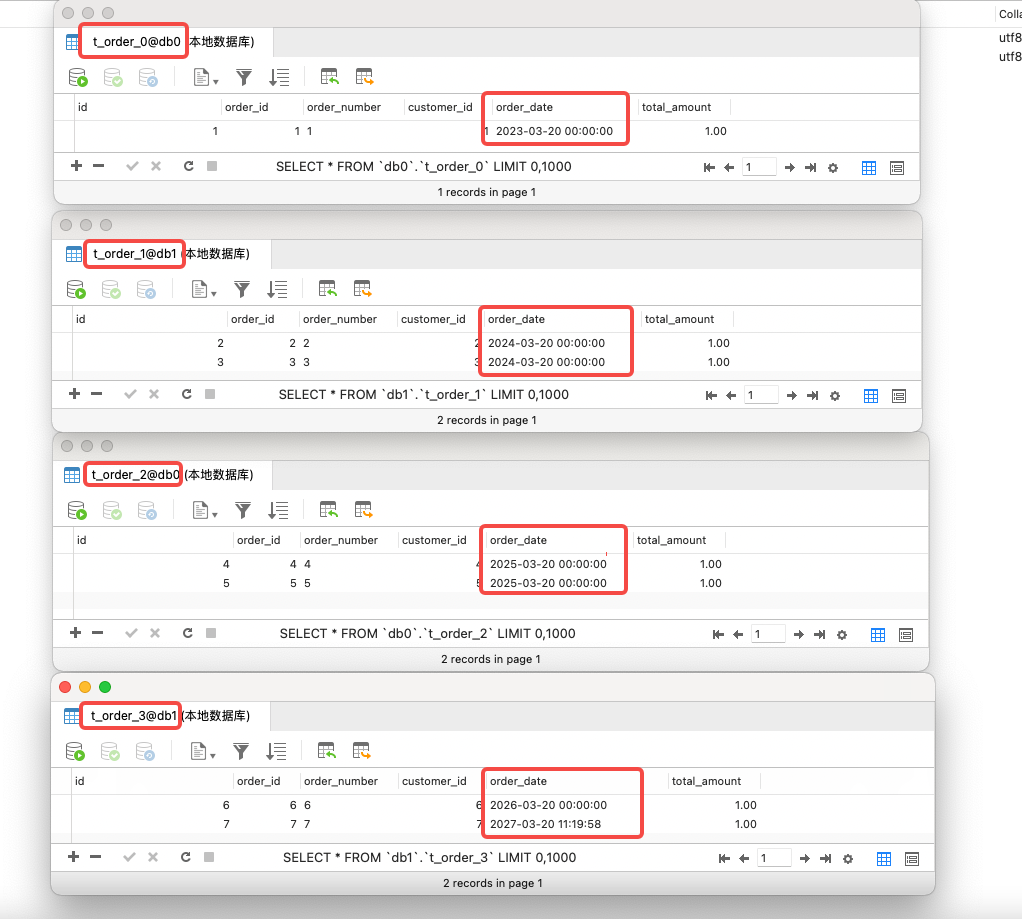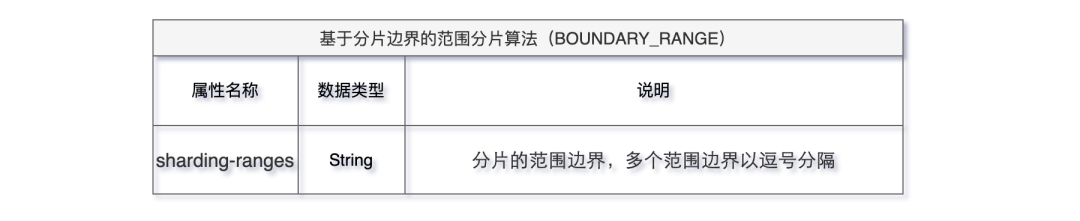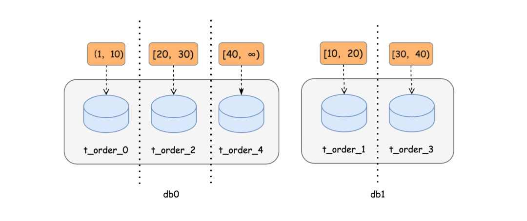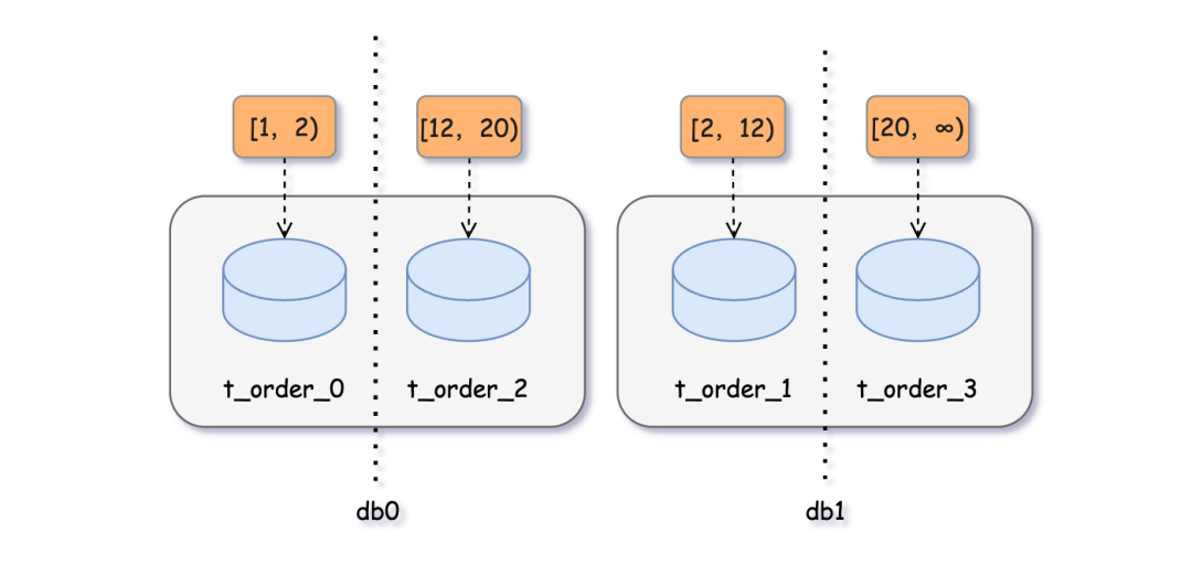这个配置的意思就是说,分片健t_order_id的值在界值 [range-lower,range-upper) 范围内,每个分片表最大存储 10 条数据;低于下界的值 [ 1,2 ) 数据分布到 t_order_0,在界值范围内的数据 [ 2,20 ) 遵循每满足 10 条依次放入 t_order_1、t_order_2;超出上界的数据[ 20,∞ ) 即便前边的分片表里未满 10条剩下的也全部放在 t_order_3。