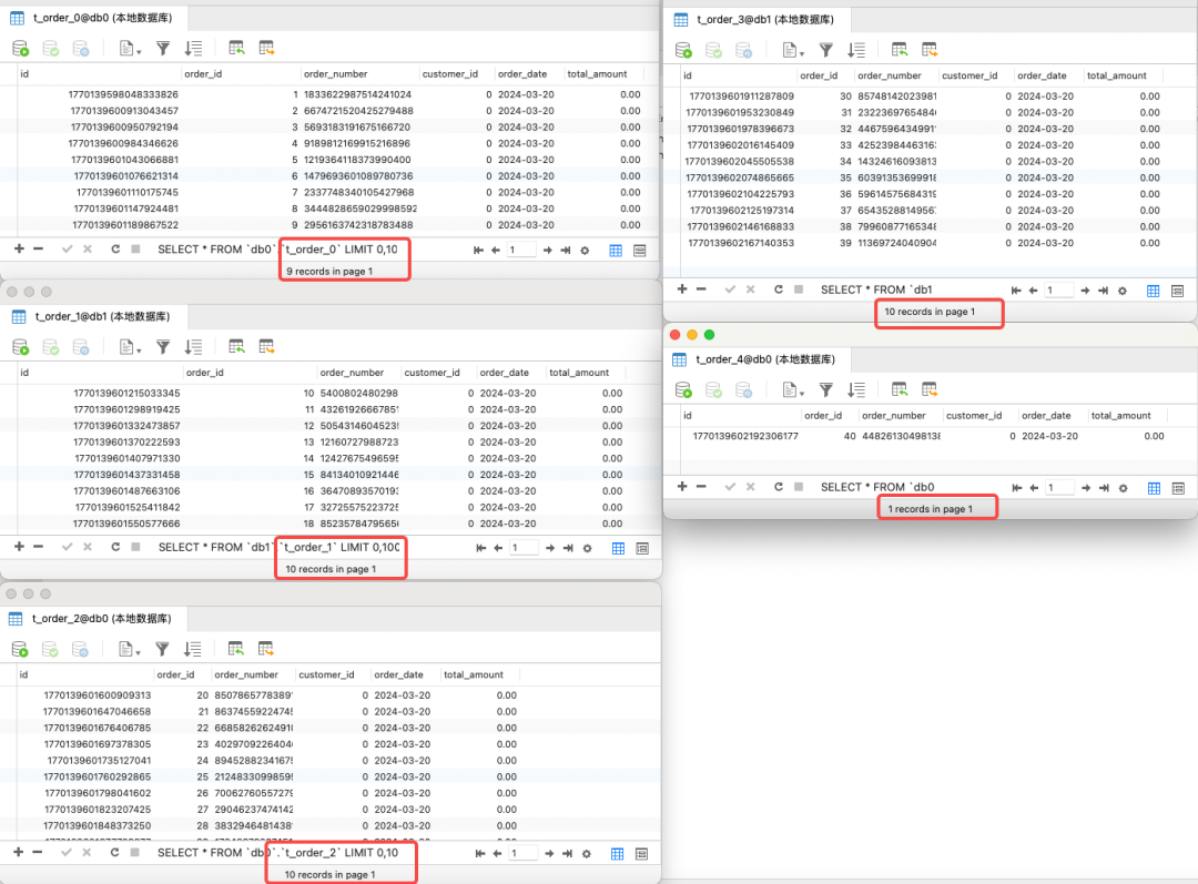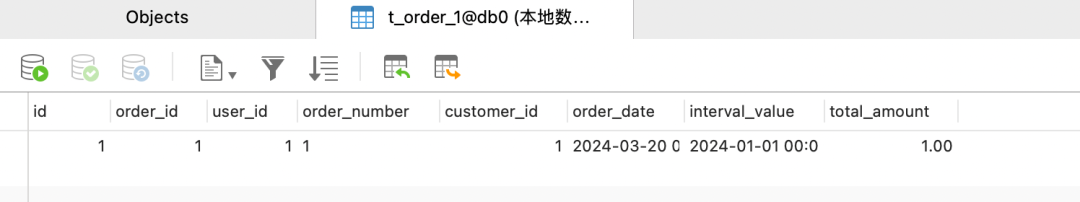 按我们设定的数据节点位置,插入一条测试数据,看到确实存在了db0.t_order_1中,完美!