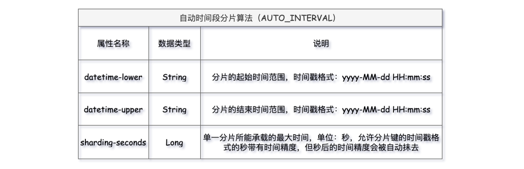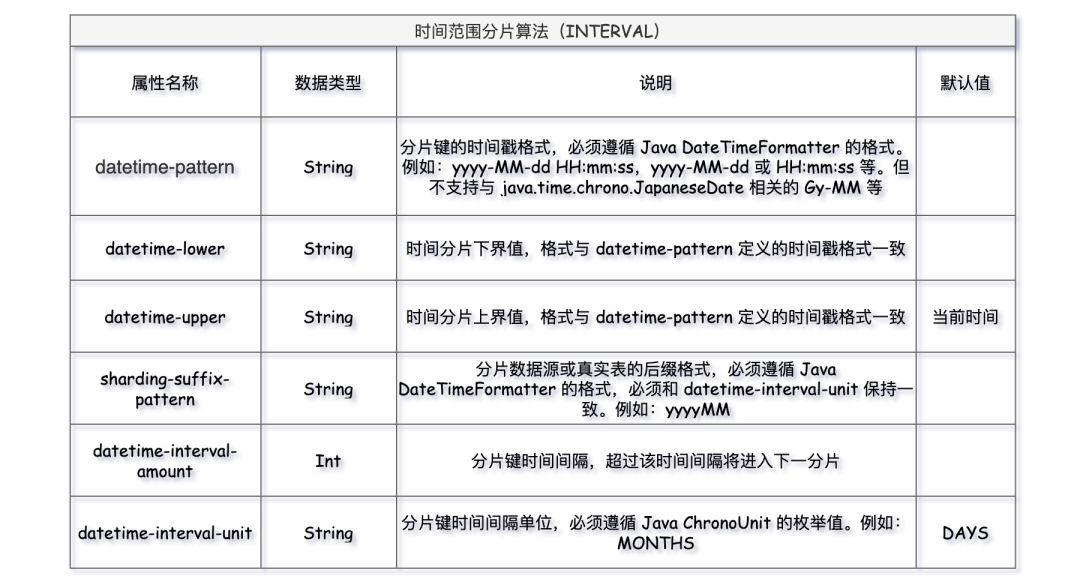 datetime-interval-unit: "MONTHS" # 分片键时间间隔单位,必须遵循 Java ChronoUnit 的枚举值。例如:MONTHS