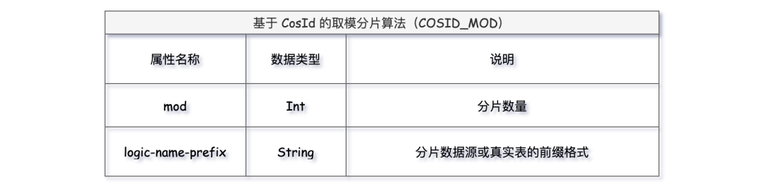 基于 CosId 的取模分片算法和普通的MOD算法使用上略有不同,mod为分片数量,logic-name-prefix分片数据源或真实表的前缀格式。