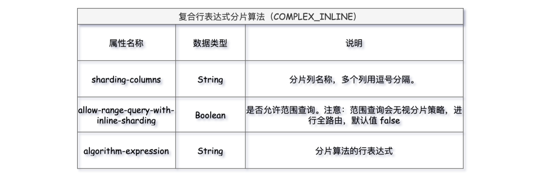 复合行表达式分片算法,适用于多分片健的简单分片场景,和行表达式分片算法使用的方式基本一样。多了一个属性sharding-columns分片列名称,多个列用逗号分隔。特别注意:使用多分片键复合算法,一定要基于复合分片策略进行设置