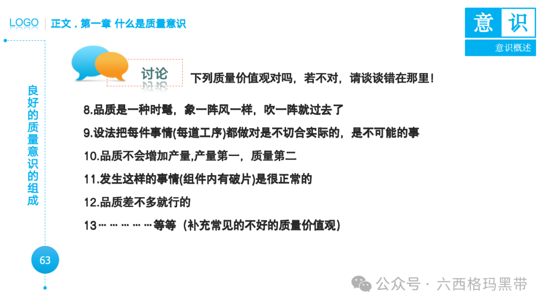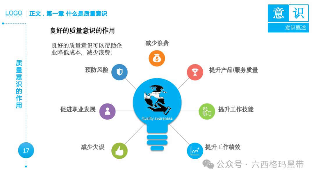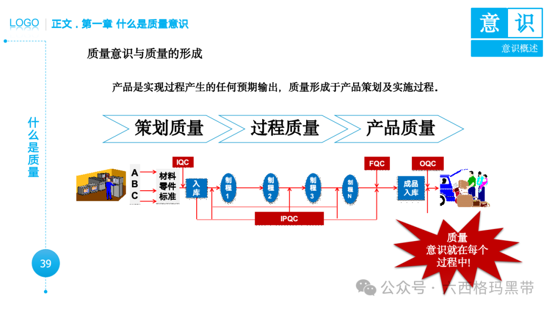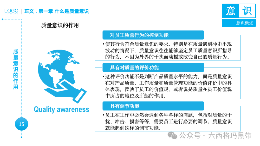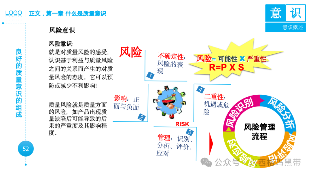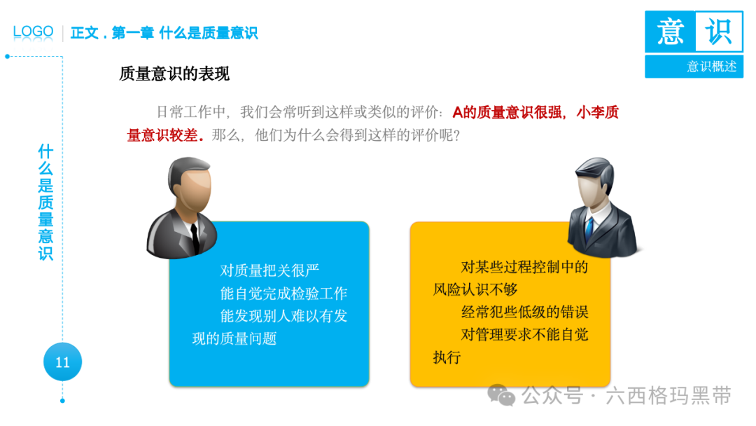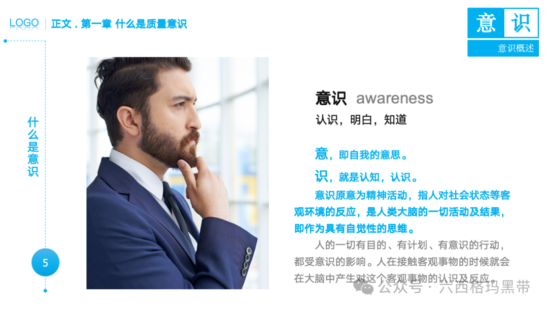• 认识:意识首先是对外界事物的认知。例如,员工在生产线上看到一个零件,能够识别出它是产品的组成部分,并且知道它应该符合什么样的质量标准。
