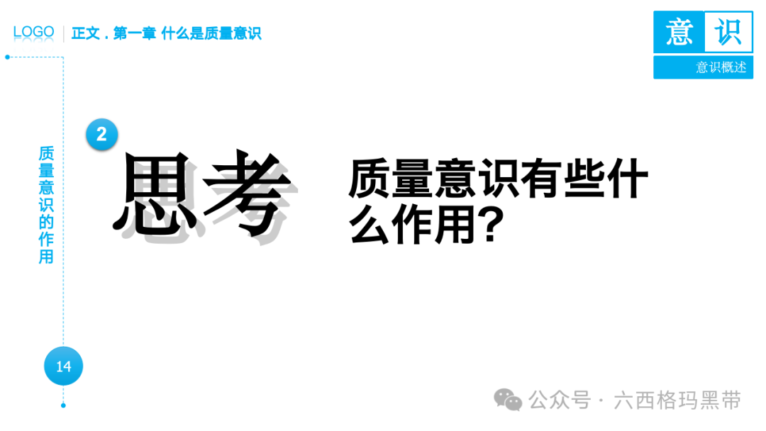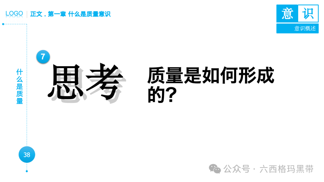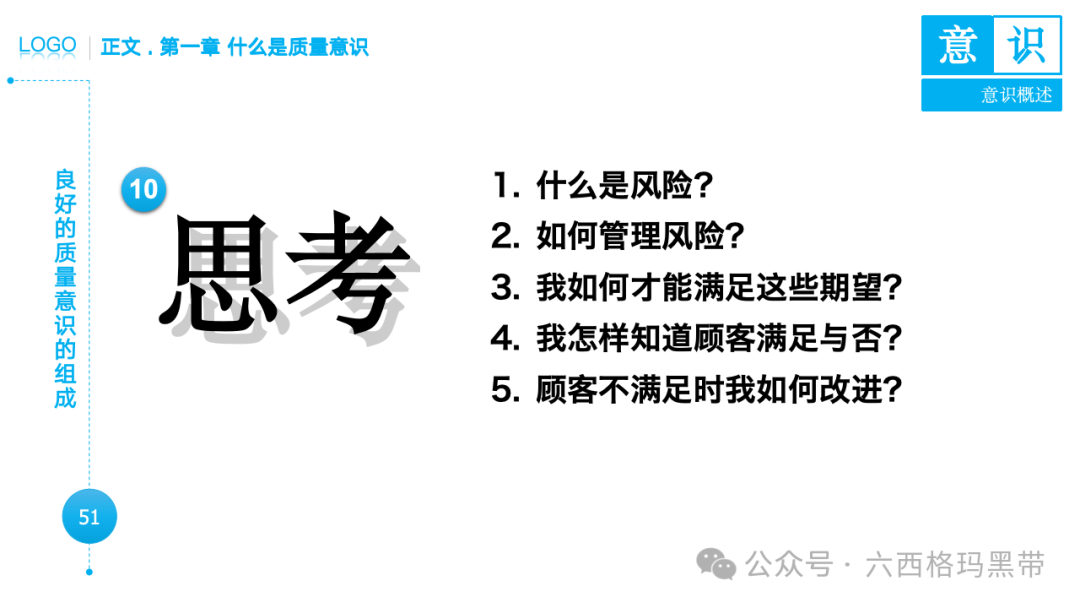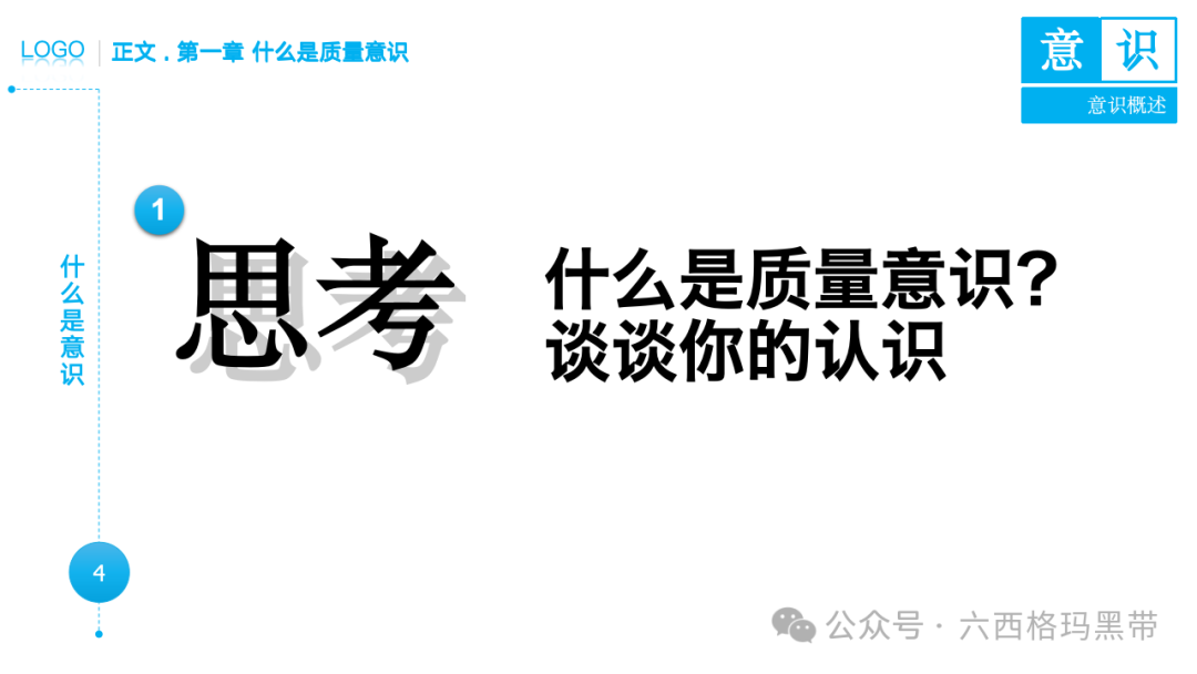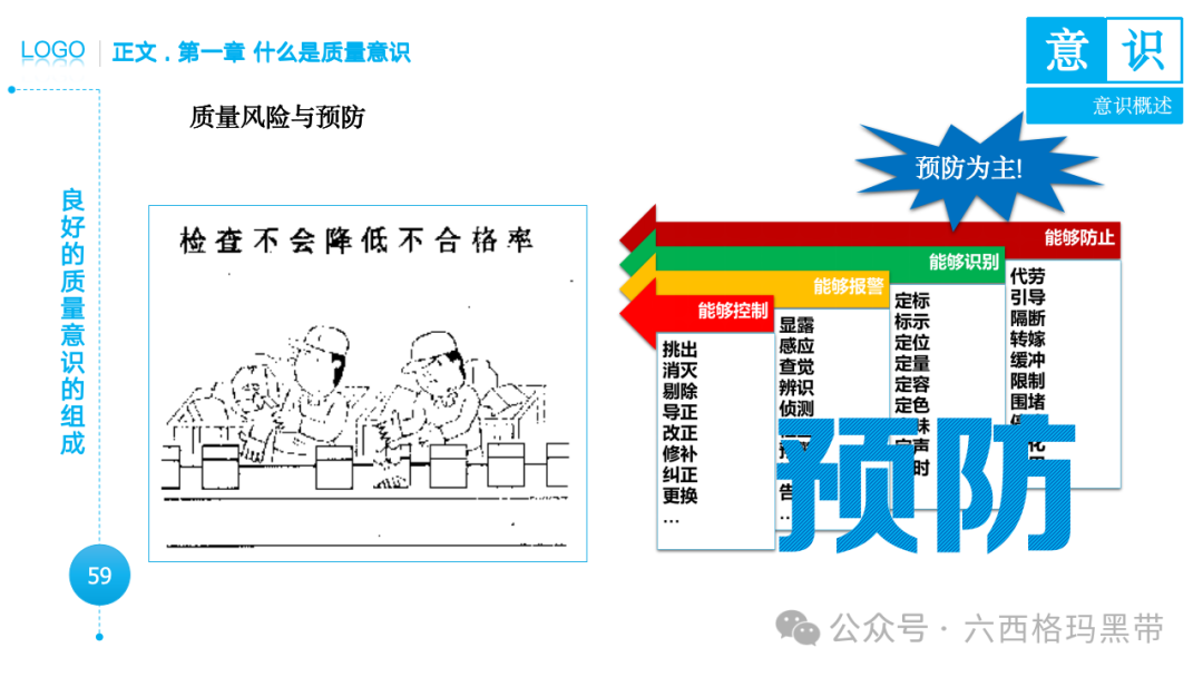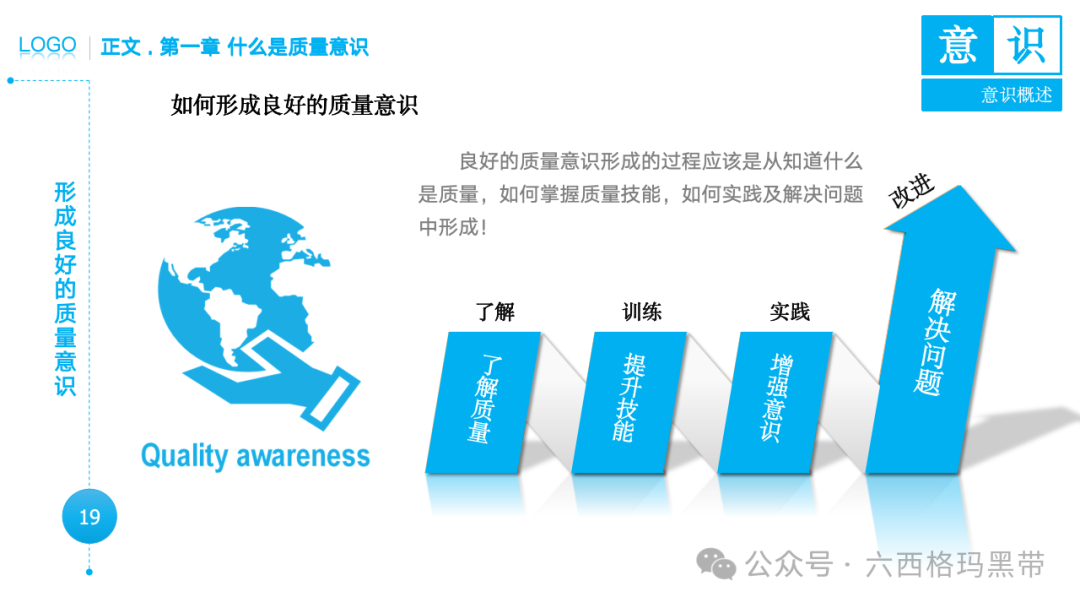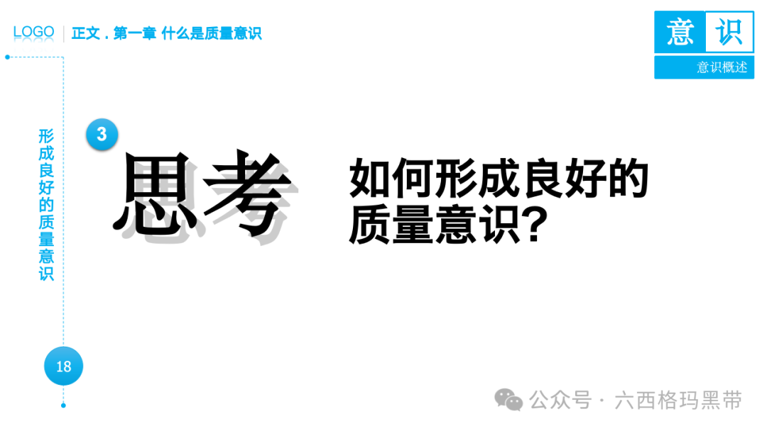 • 认识:意识首先是对外界事物的认知。例如,员工在生产线上看到一个零件,能够识别出它是产品的组成部分,并且知道它应该符合什么样的质量标准。