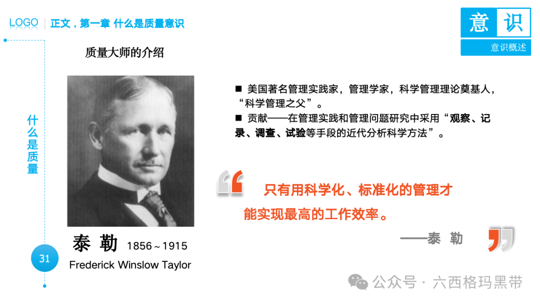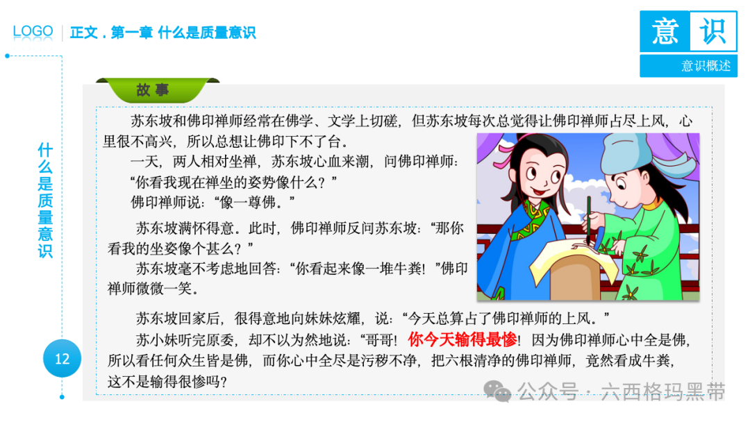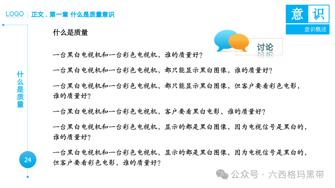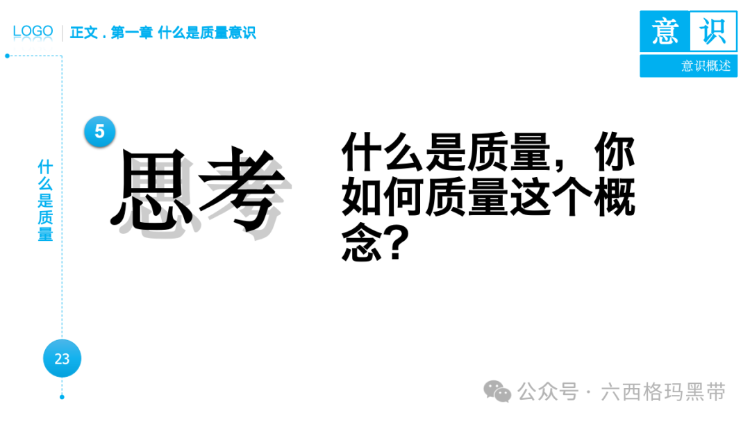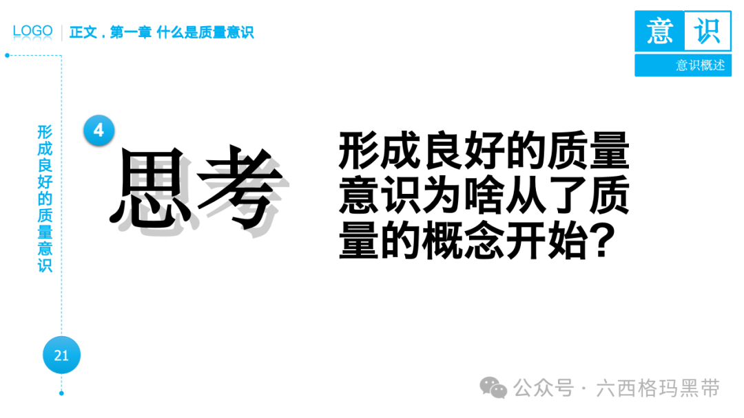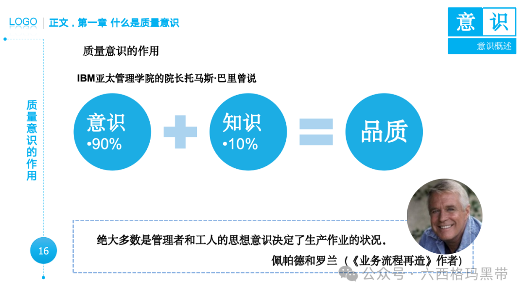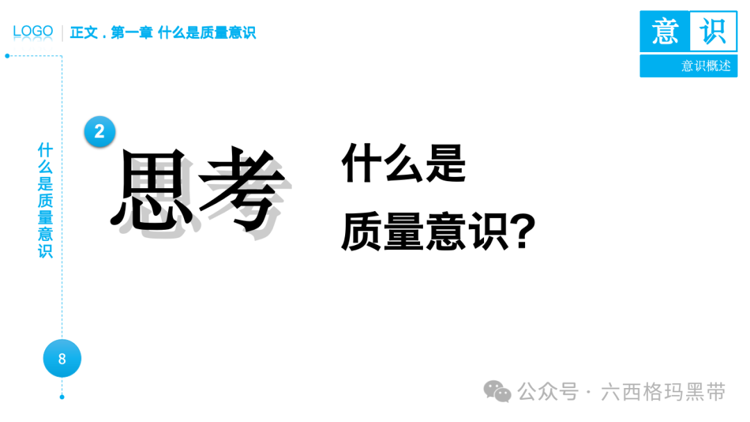 • 认识:意识首先是对外界事物的认知。例如,员工在生产线上看到一个零件,能够识别出它是产品的组成部分,并且知道它应该符合什么样的质量标准。