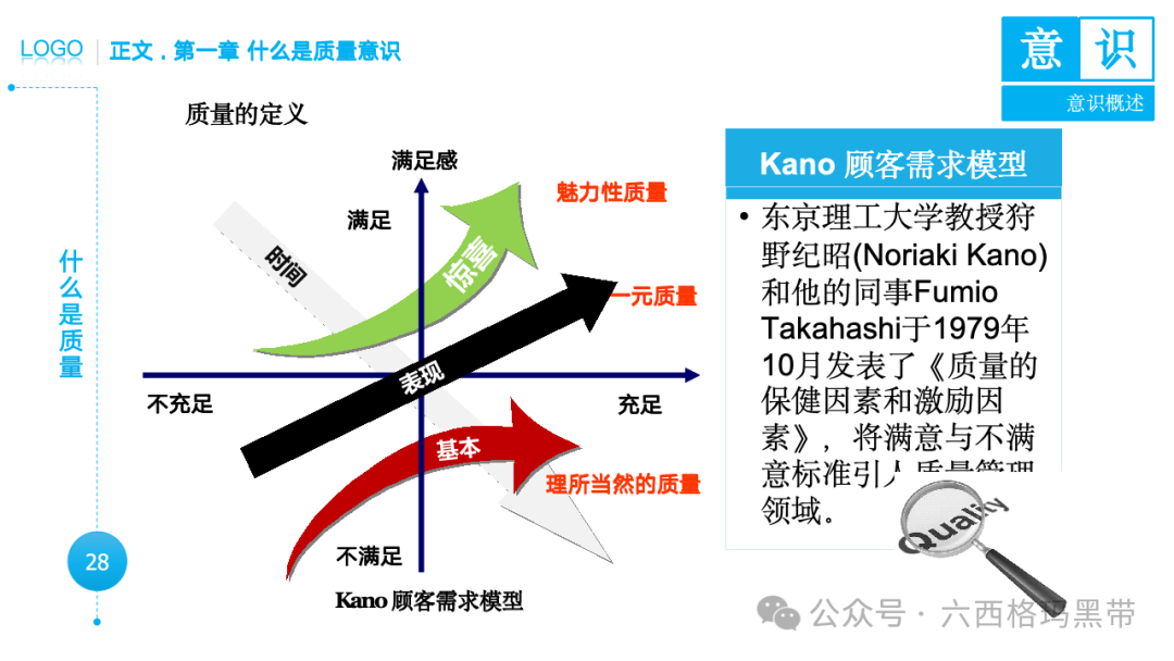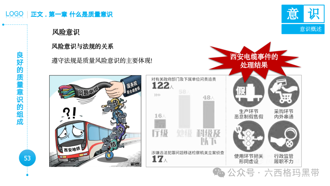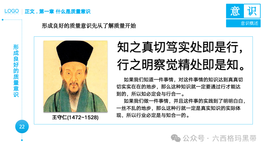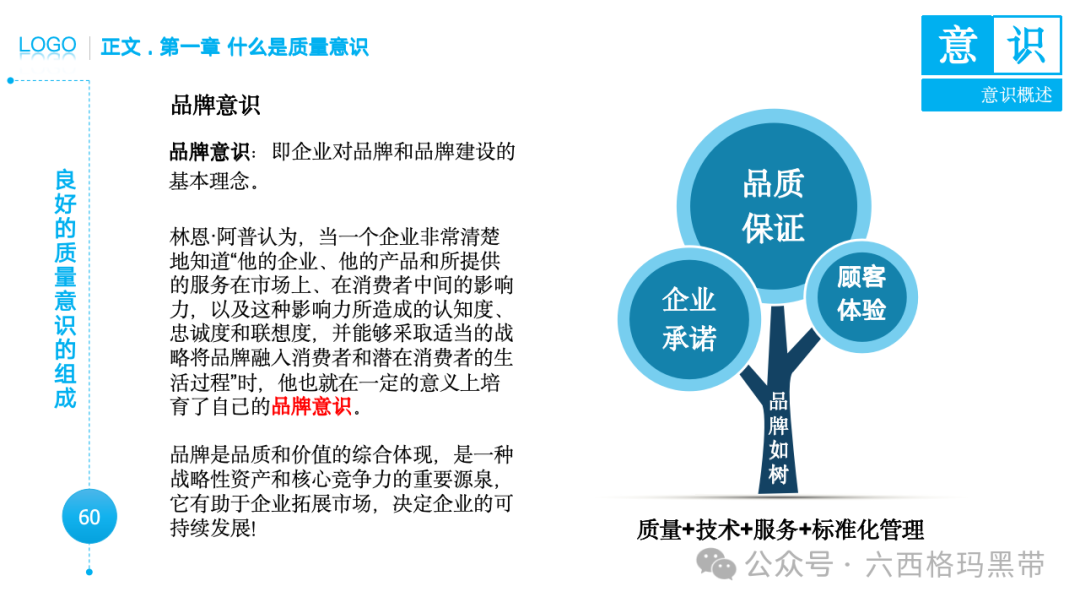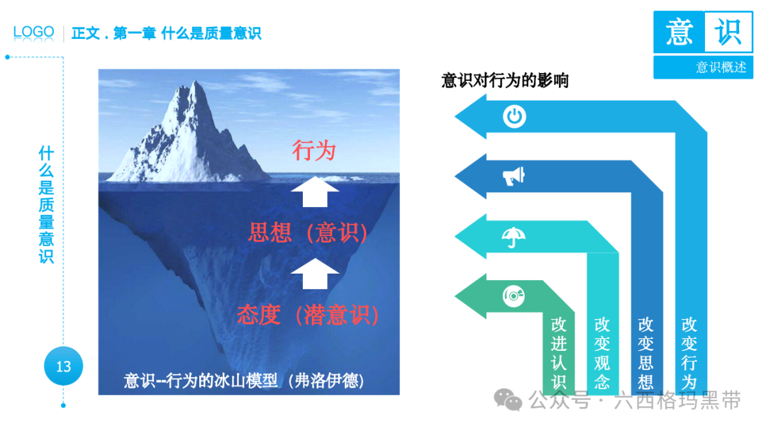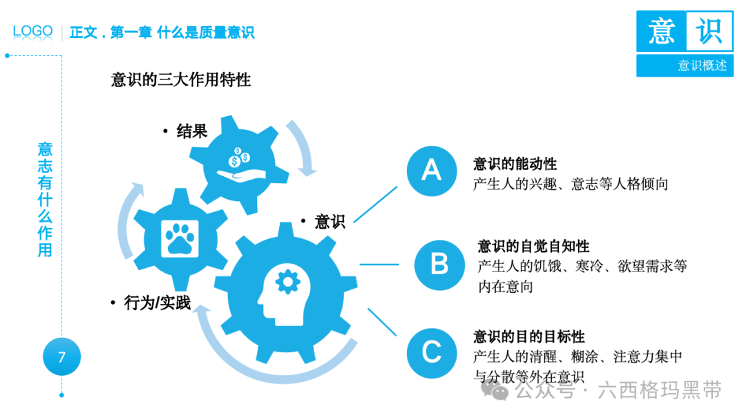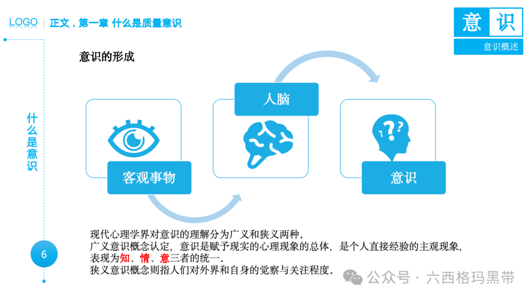 • 广义意识:包括认知(知)、情感(情)和意志(意)三个方面。例如,员工在工作中不仅需要知道质量标准(认知),还需要对质量工作有积极的情感(情感),并且有意愿去执行质量标准(意志)。