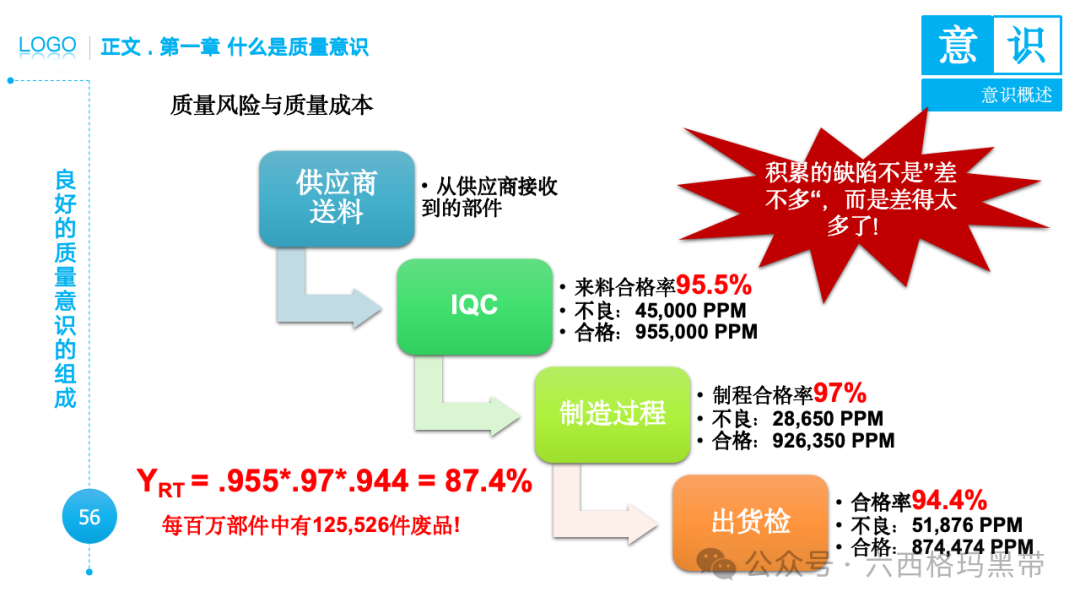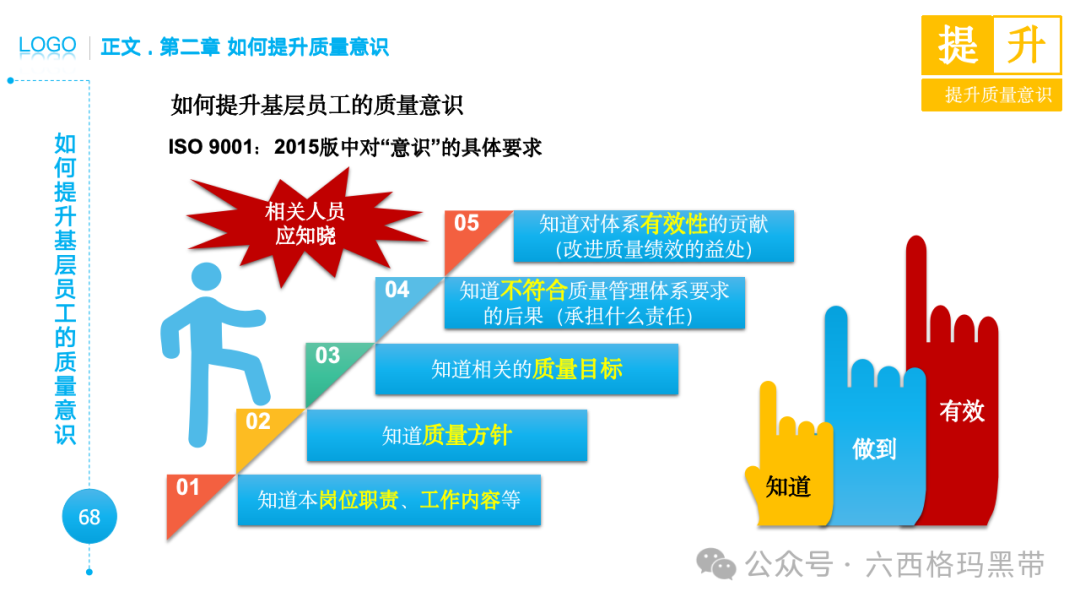• 明白:意识还包含对事物的理解。员工不仅要识别出零件,还要明白它在产品中的作用,以及它对产品质量的影响。