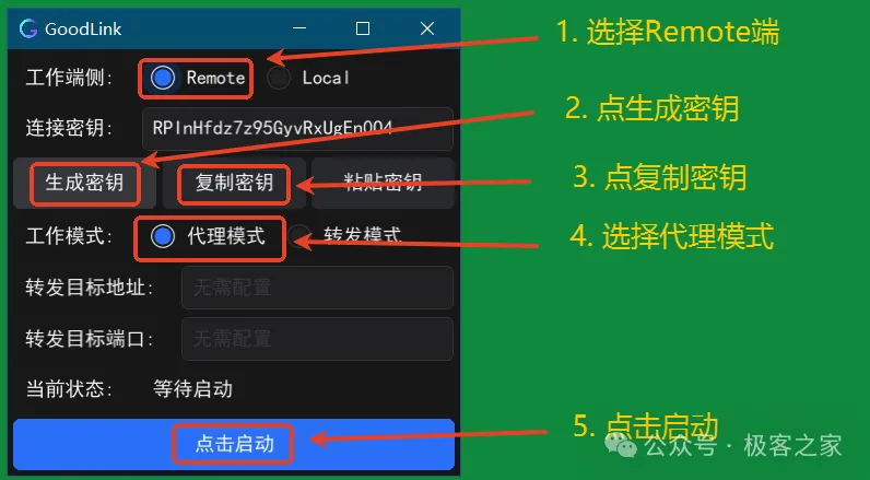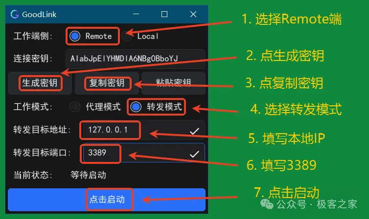 注: 转发模式仅支持TCP协议,一个remote端只能转发一个端口,可运行多个remote端