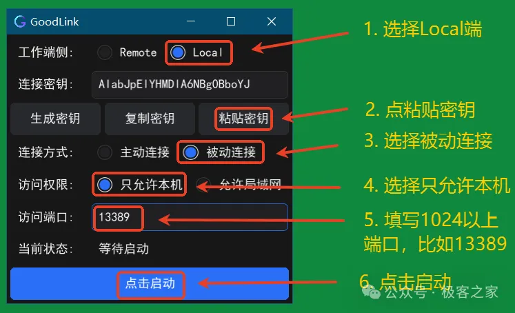 注: 当最下方的按钮变成绿色,表示连接成功。如果超过 10 分钟无法连接,按照下图先“点击关闭”,然后选择“主动连接”,再“点击启动”