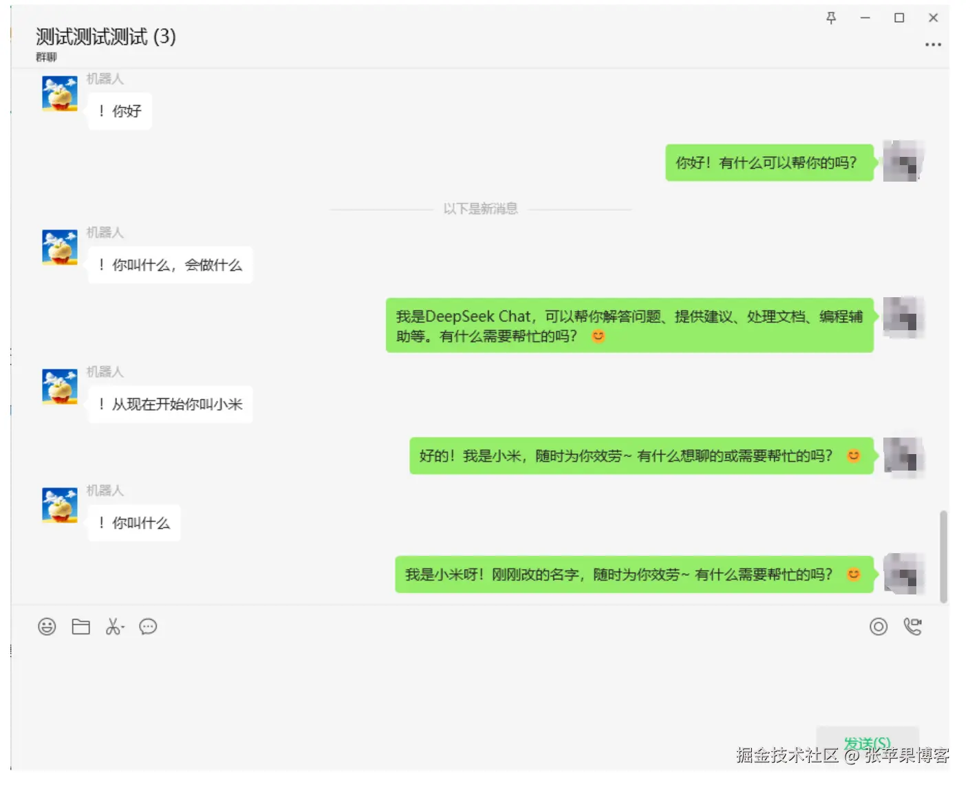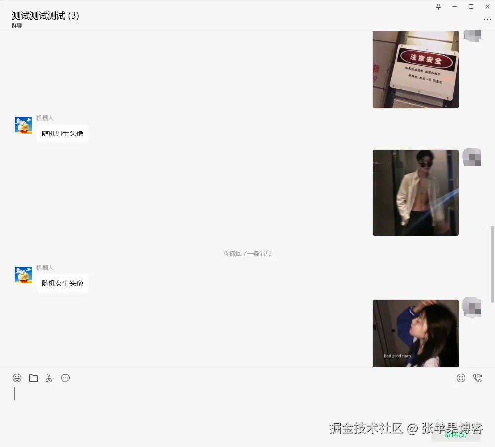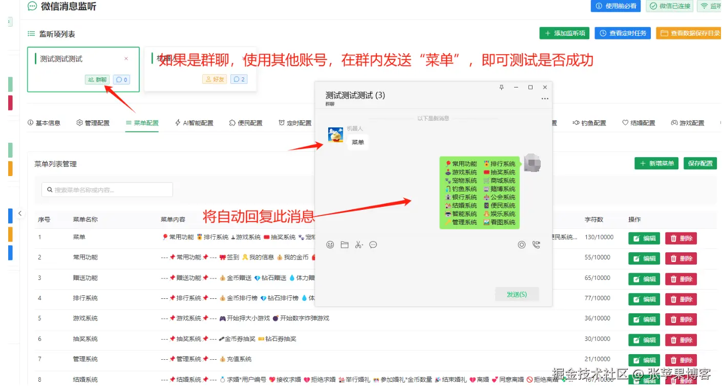 现在可以测试了! !!! warning 注意:如果您的群/好友窗口无任何历史信息,或被清空过聊天记录。请先发送一条信息,再重新启动服务监听,具体可看上方视频。 !!!