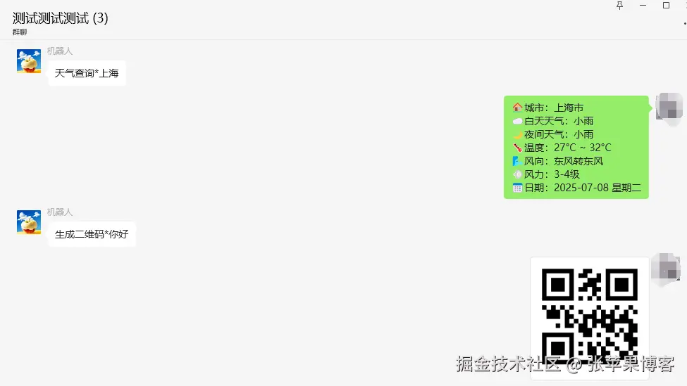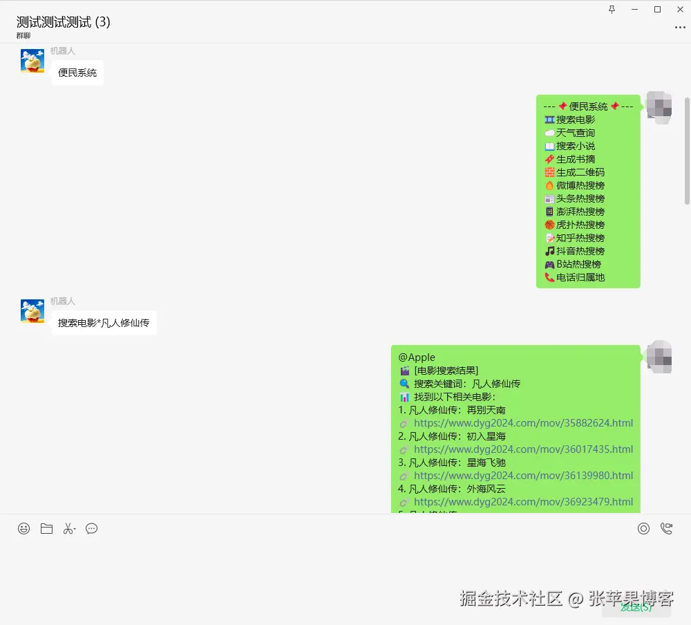 🤖 AI聊天:智能问答,什么都能聊☁️ 天气查询:查天气预报🎞️ 搜电影:找电影资源🧱 生成二维码:把文字变成二维码🔥 热搜榜:看各大平台热搜💡...其他
