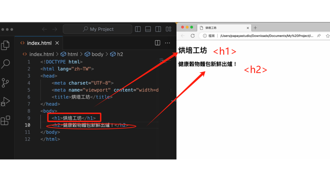 同样,为了更直观地了解<h1>与<h2>之间不同的效果,在vscode中ctrl+s将文件储存后,在浏览器点击刷新网页就可看到你所写代码的最新效果。