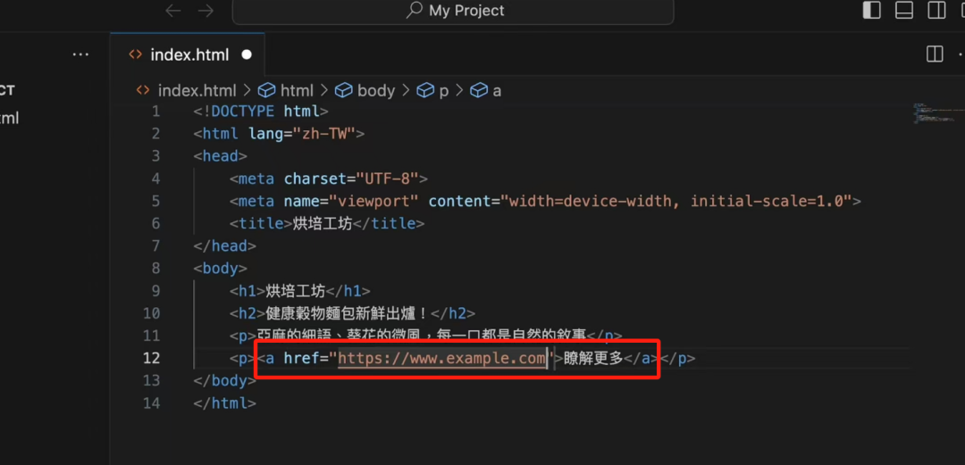 或是当前目录中的某个网页,由于当前这是你手写的第一个网页,还没有建立其它的页面,所以这里暂时 href="#" 就ok了
