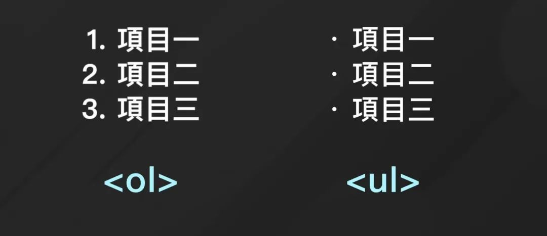 <ol>                           // 清单开头使用<ol>标签  <li>第一步:准备材料</li>      //清单内容使用<li>标签  <li>第二步:搅拌混合</li>  <li>第三步:烤箱烘焙</li></ol>
