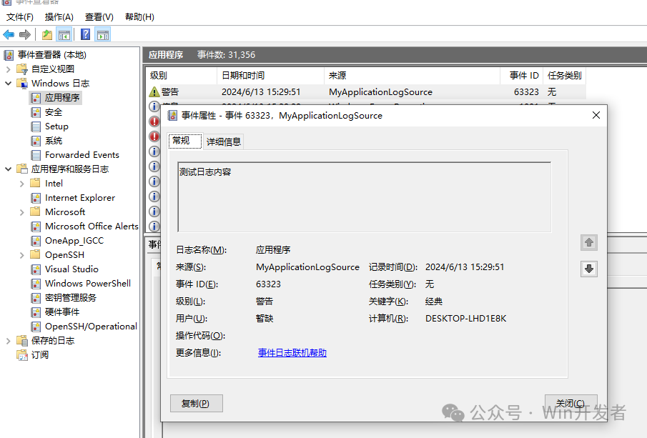 运行后,可以看到增加了一个MyLog日志,并增加了一条类型为警告的记录