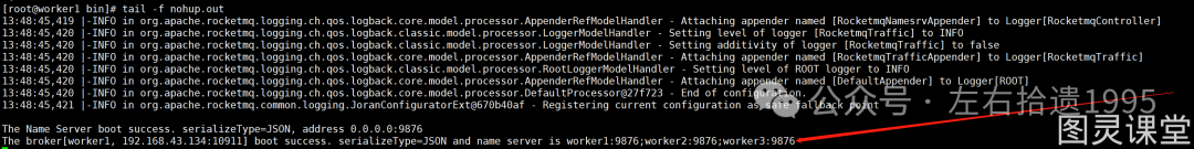 2.查看日志,显示如下即显示成功********每次启动broker时都要关注是否注册到目标nameserver上(name server isworker:9876)
