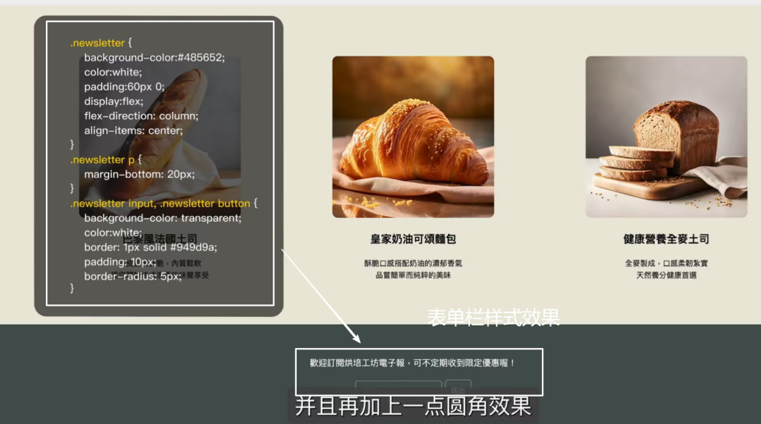 主要模块 • 电子报订阅区块 (section#newsletter) ◦ 包含标题说明(<p>标签的中文提示) ◦ 表单(<form>)含两个核心元素: ▪ 邮箱输入框:<input type="email"> 限制用户只能输入有效邮箱格式 ▪ 提交按钮:<button type="submit"> 触发表单数据提交 注意:上述表单未定义action(数据提交地址)和method(GET/POST请求方式),提交后无法处理数据。 (由于我们当前处于零基础新手阶段,只先对前端设计部分做一个大致的了解。至于表单提交后如何与后台服务器做互动,我们这里就先暂且省略了。) 此时我们的表单栏框架已通过html搭建好 框架目前是很粗糙的,接下来就又到了CSS的美化环节啦。 CSS美化部分 整体功能解析