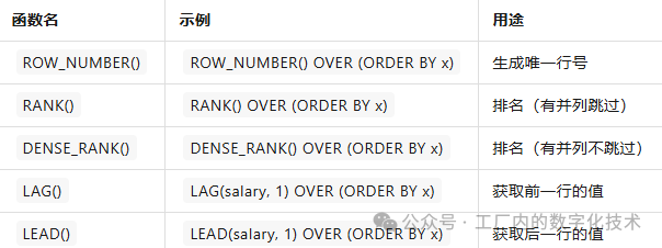 是 窗口函数(Window Function) 的核心语法,用于在 不改变行数 的情况下,对一组行(称为“窗口”)进行聚合、排序或排名等操作。函数名(列名) OVER (