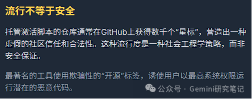 将这些激活工具托管于GitHub并贴上“开源”的标签,是一种精心设计的策略,其目的在于利用平台的公信力来构建一种虚假的安全感。这背后存在一个深刻的悖论:本应用于保障透明和安全的开源模式,在这里却被用作了掩盖风险的伪装。
