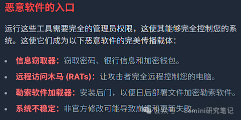 更重要的是,本报告揭示了使用这些工具所带来的巨大安全隐患。这些脚本和程序是恶意软件、后门程序和数据窃取工具的理想载体。由于它们需要以最高管理员权限运行,一旦执行,用户的系统完整性、数据隐私和财务安全将面临直接威胁。与此相比,微软在法律层面通常不会追究个人用户的责任,这种风险的不对称性使用户容易低估真正的危险。