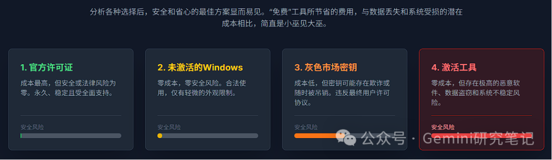 微软官方对此的建议非常明确:“警惕单独出售的产品密钥”(Beware of Product Keys Sold Separately)。因此,购买灰色市场密钥并非一个安全的替代方案,它只是将执行未知脚本的直接风险,转换为了欺诈、财产损失和激活状态不稳定的间接风险。