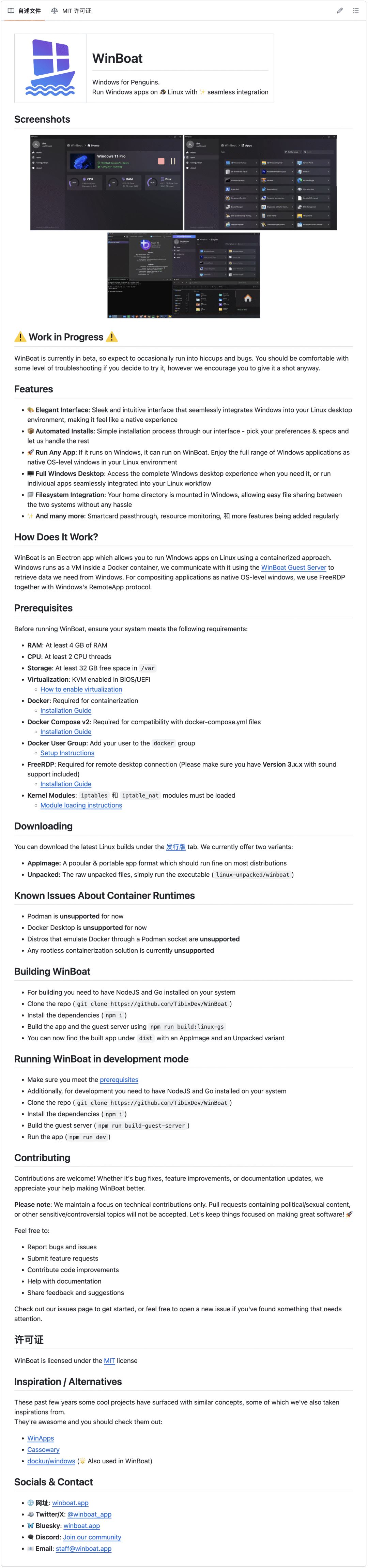 从 GitHub Releases 下载最新 Linux 构建:AppImage(便携格式,大多数发行版兼容)或 Unpacked(原始文件,运行 linux-unpacked/winboat);克隆 git clone https://github.com/TibixDev/WinBoat.git;构建:npm run build:linux-gs(生成 dist/ 中的 AppImage 和 Unpacked);构建客端服务器:npm run build-guest-server;使用流程
