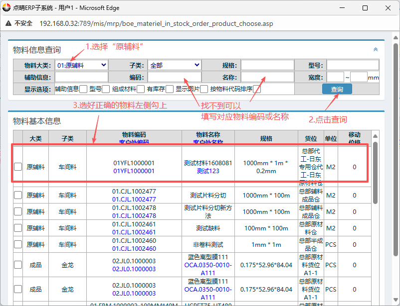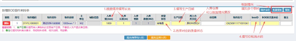 然后点击打开“新增BOE组件来料单”。 2.进入“新增BOE组件来料单”界面后,先填写好基本的信息:入库仓库、收货日期。 以及有需要的话可以根据情况填写来料的备注信息。 3.填写BOE组件来料单的信息,首先点击“物料编码”,接着就会弹出查询物料的窗口。 按照图里的顺序在物料大类选择“原辅料”,然后点击查询(如果找不到的话可以填写对应的编码和名称)。